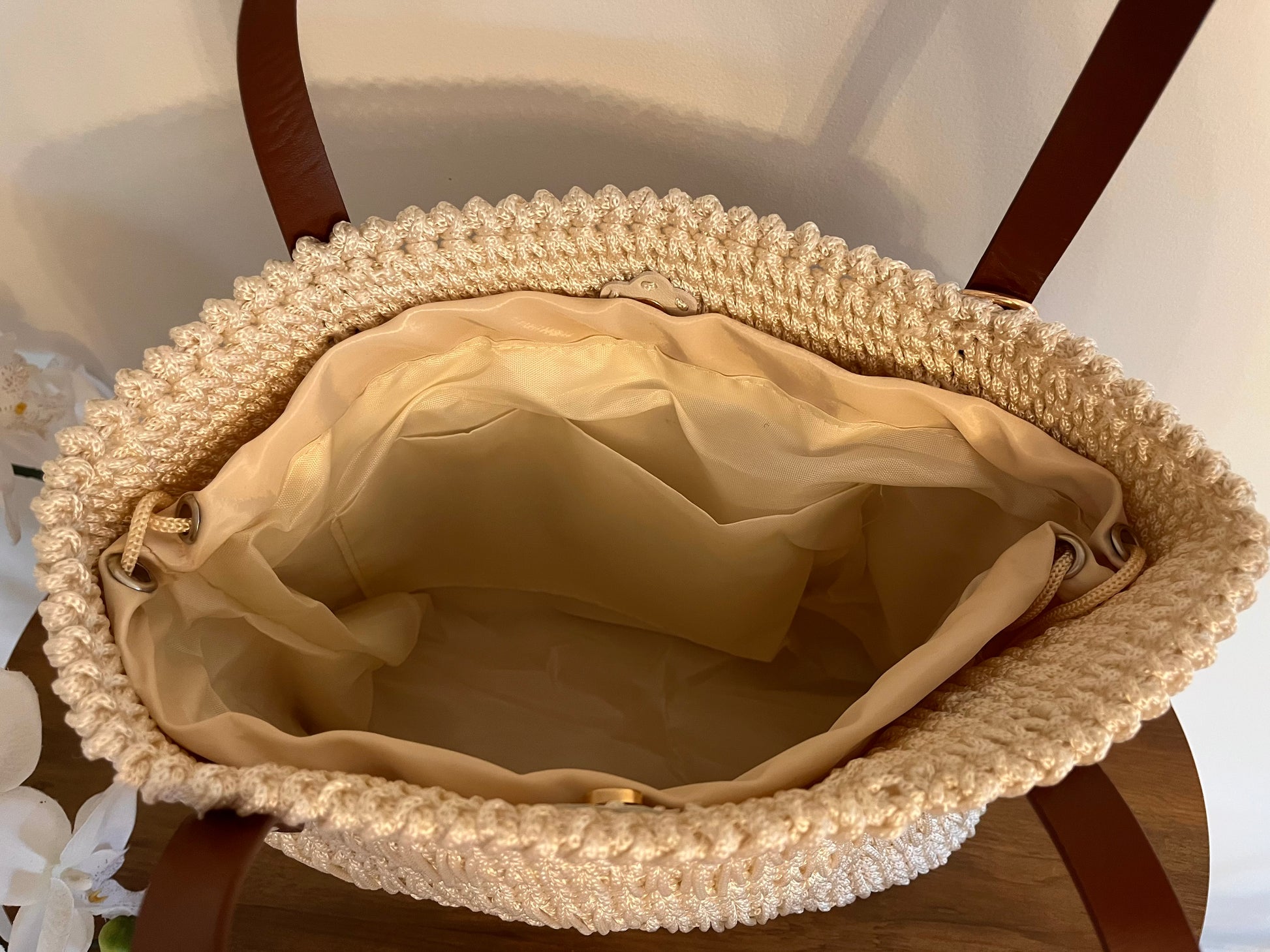 Featuring a beautifully textured crochet body in a soft natural hue with matching cream PU leather base. Smooth brown PU leather handles delicately hand stitched with a silk - inspired scarf bow fully removable keyring lending a touch of femininity and vintage romance.