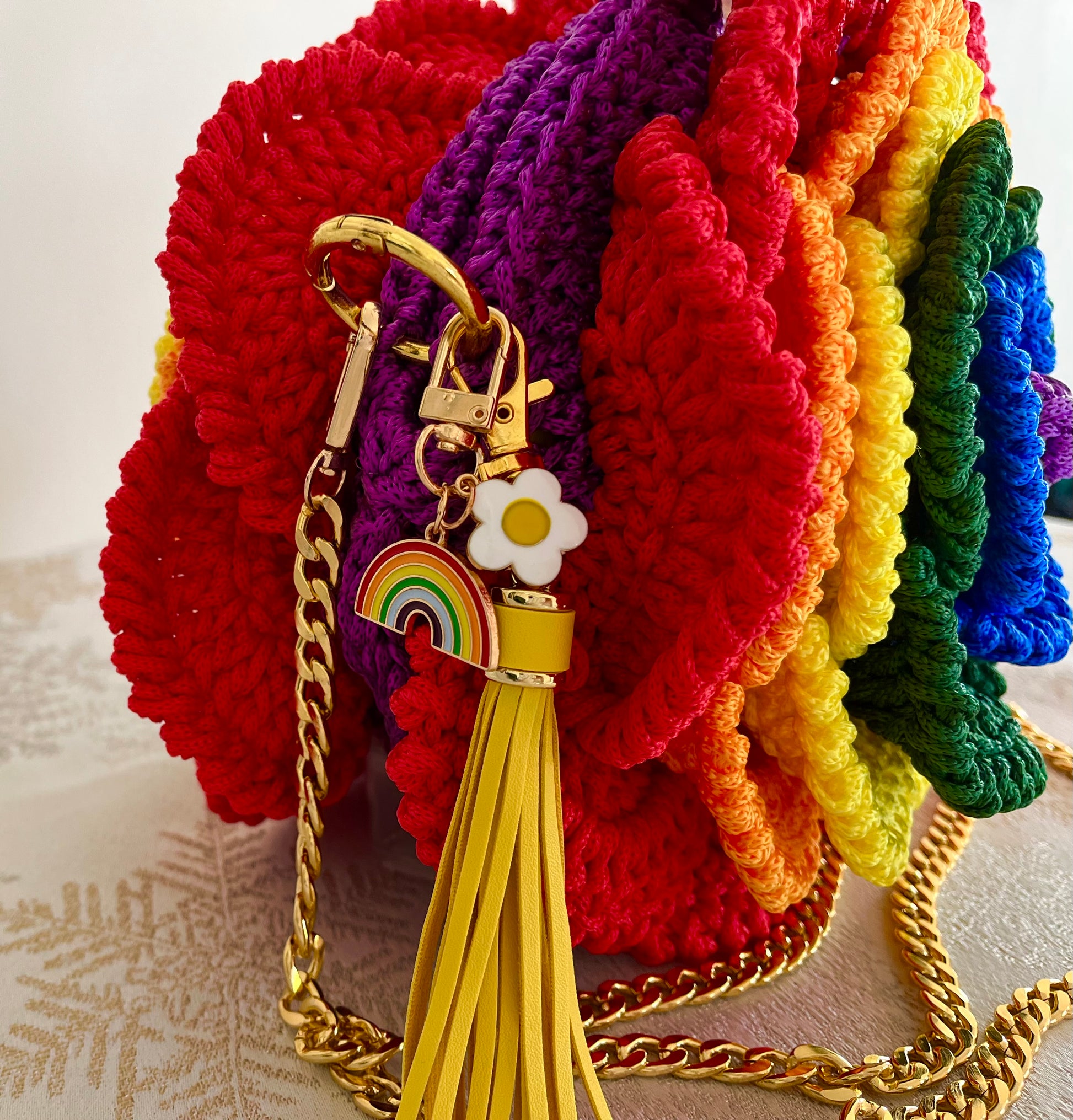 - 2 Detachable keychains, one an elegant yellow tassel detail, the other a rainbow with white flower detail